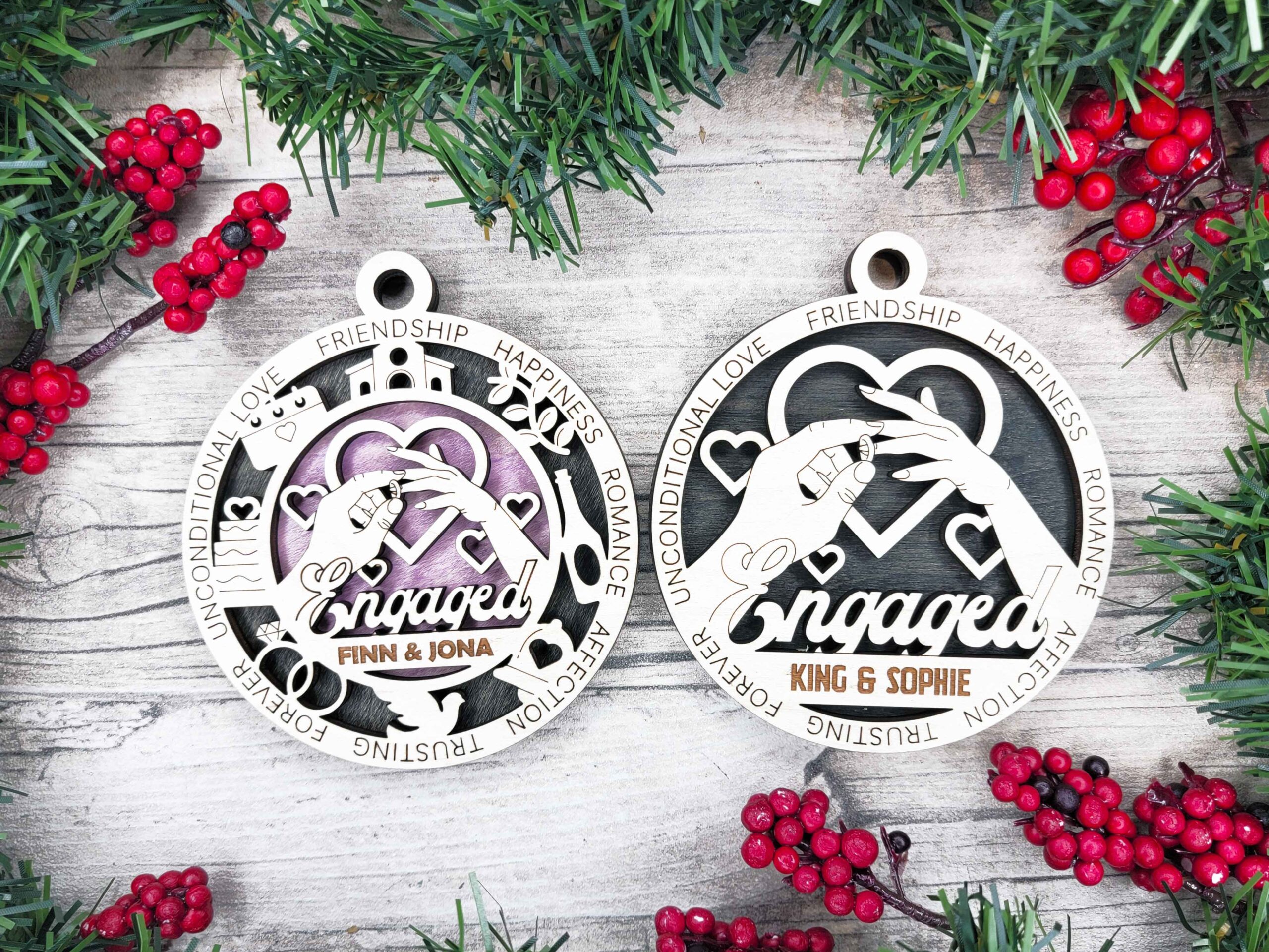 Celebrate your first Christmas after getting engaged with this customizable ornament.
