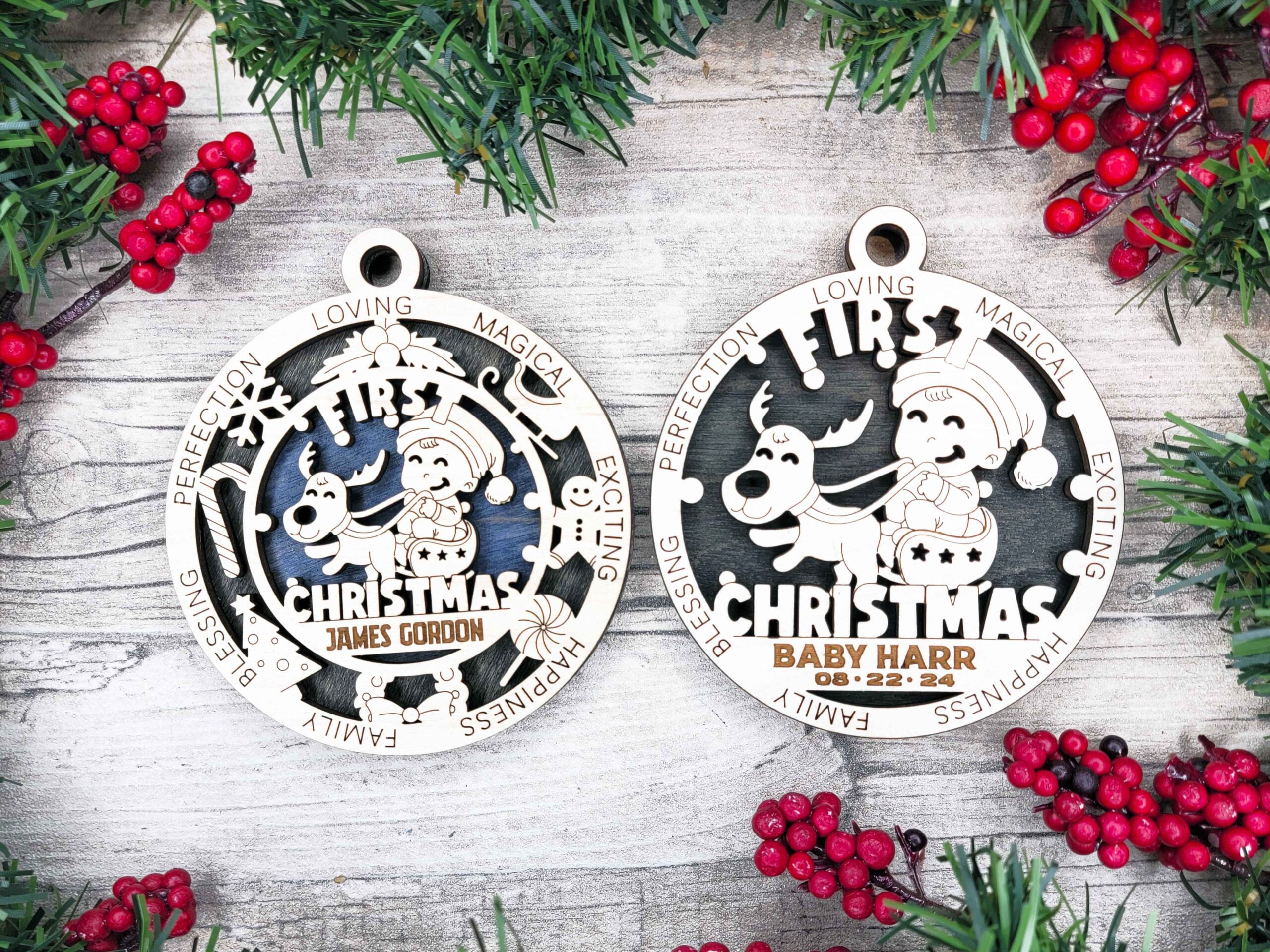 Celebrate baby’s first christmas with this personalized ornament, featuring a toddler on a rocking horse surrounded by icons of many things Christmas.   4″ diameter.