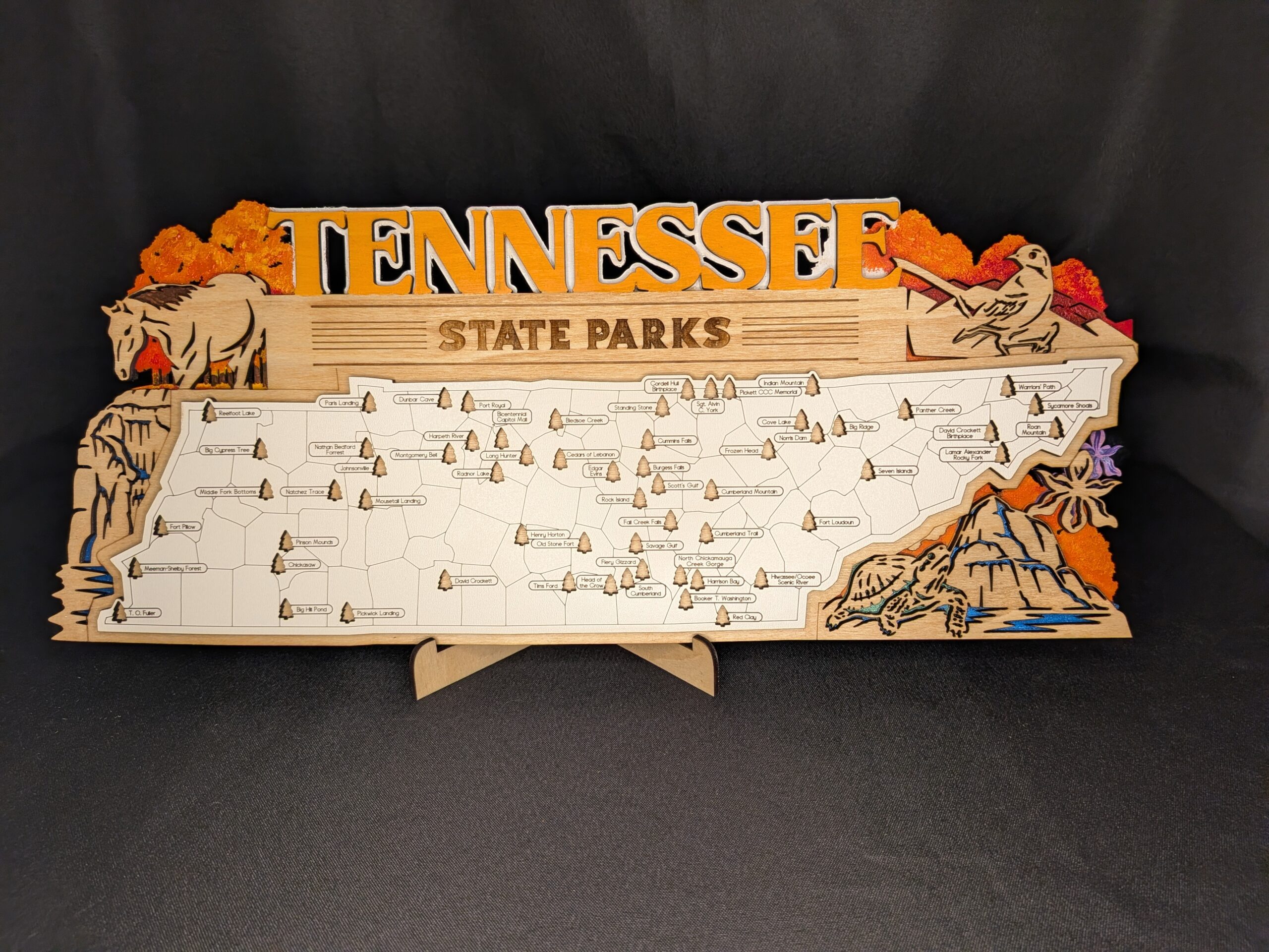 Our TN State Park tracker map is a great way to keep up with all of the wonderful local parks that have been visited.  Each tracker map is made from multiple layers of wood and decorated with a combination of stains and paints. Each map comes with a personalized box of 60 trees that you can insert into the open location for each park as you visit (there are 57 parks on the map, which is current as of January 2025). Price includes personalization of the family name engraved on the tracker box.