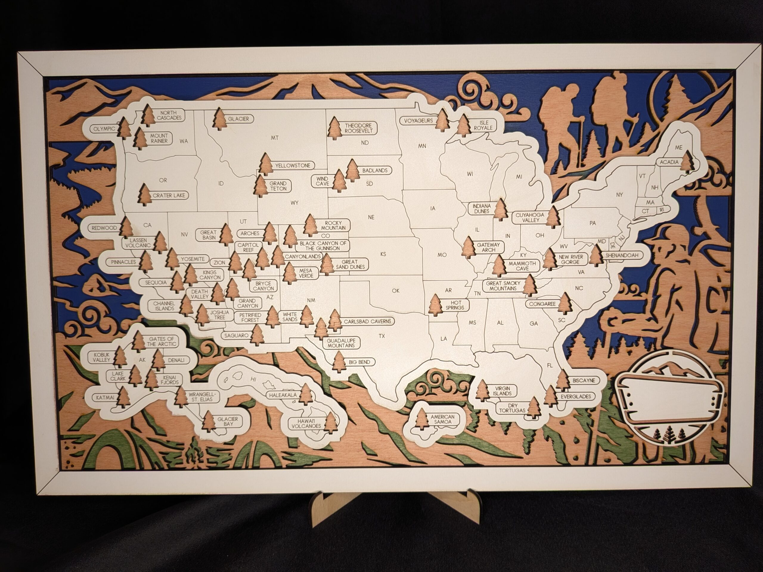 Keep track of your journey to the US National Parks in this beautifully stained piece made of separate layers of 1/8″ Baltic Birch – precision laser cut and hand stained before being glued together.  Comes with tree shaped markers to put into each park as you visit.