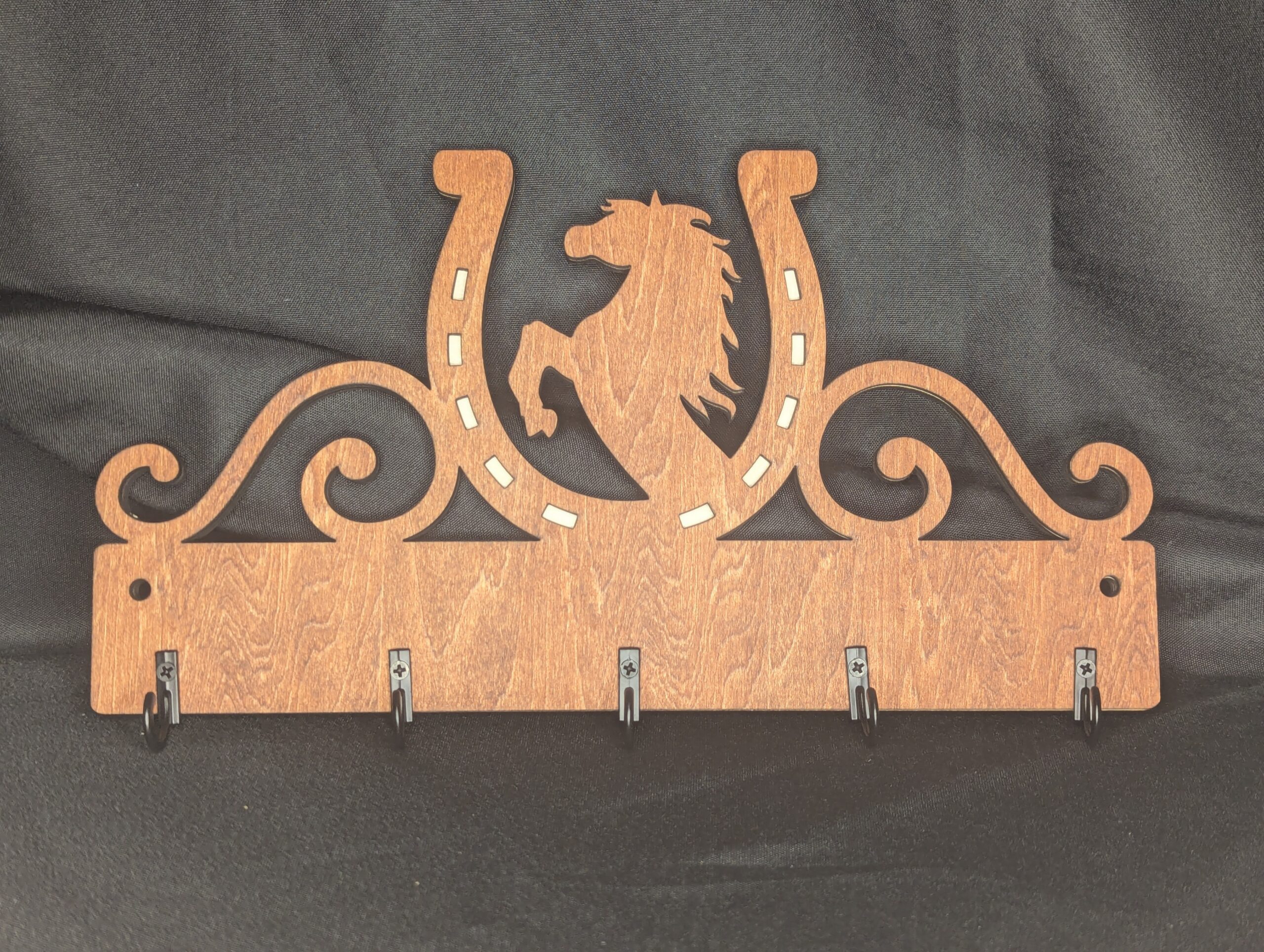 Comes with 5 eye hooks for holding key rings and 2 pre-drilled holes in the base for wall mounting.