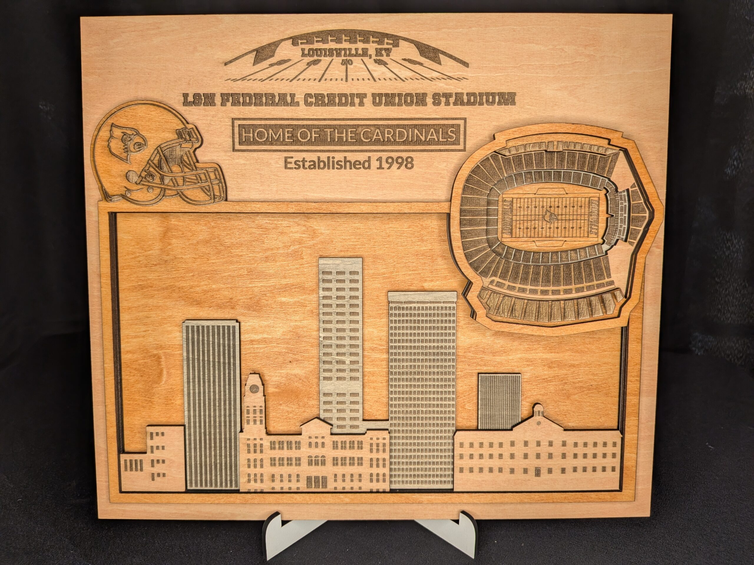 Home of the Louisville Cardinals! Show your love for the team with this 3d plaque made from multiple layers of hand stained 1/8″ thick plywood. Featuring the background of Lousville, KY, and a multi-level replica of the stadium interior.