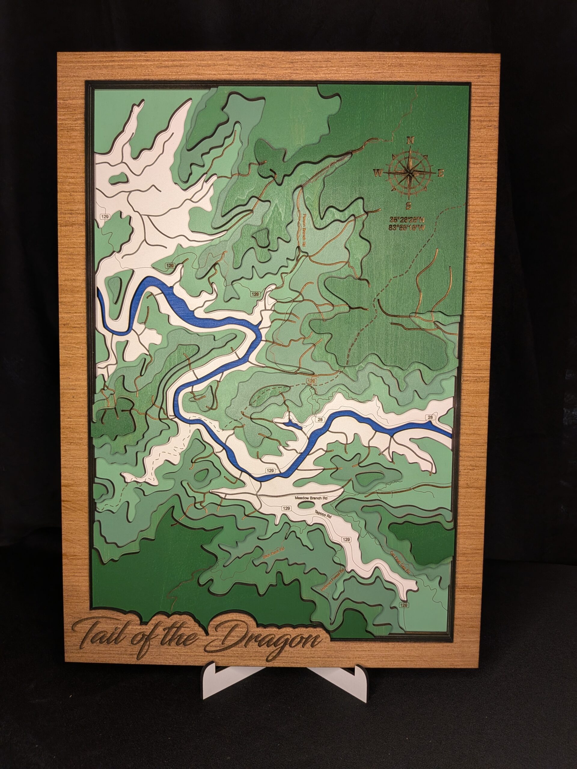 This beautiful piece is made from a mixture of 1/4″ and 1/8″ thick plywood and MDF sheets, painted in a gradient to enhance depth perception.  This is made from USGS topographical survey maps and has the street names engraved into the appropriate layers.  The compass at the top includes the GPS coordinates, but can also be replaced with a nameplate that is personalized for your own needs, such as a rally name or the date you first rode The Dragon.
