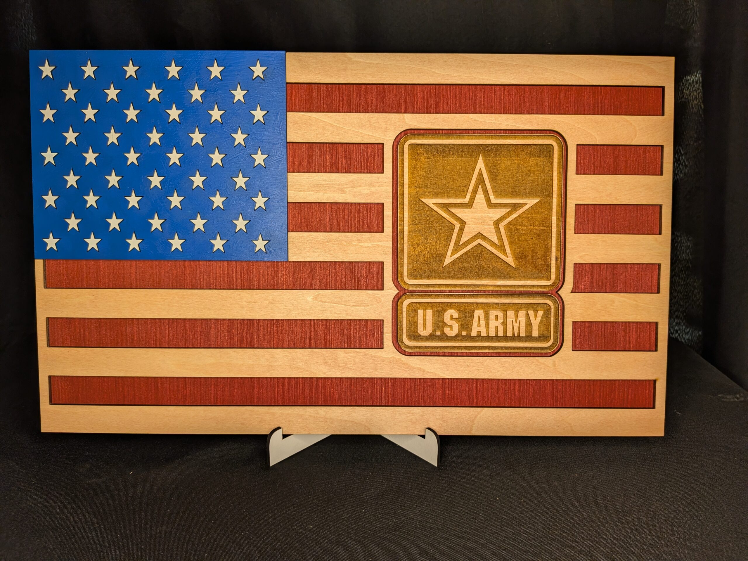 Show pride in your service or that of your family members with this beautifully crafted US Army service flag. The bottom layer is made from 1/4″ plywood that has been stained barn red, then the top layer has been intricately cut out of a combination of stained and painted 1/8″ basswood and MDF (the stars). This flag measures approximately 10″ x 16″ and looks good on a desk or hanging on the wall. It can be personalized with service information if desired, simply reach out to us with specifics so that we can ensure we make it the way you want it.