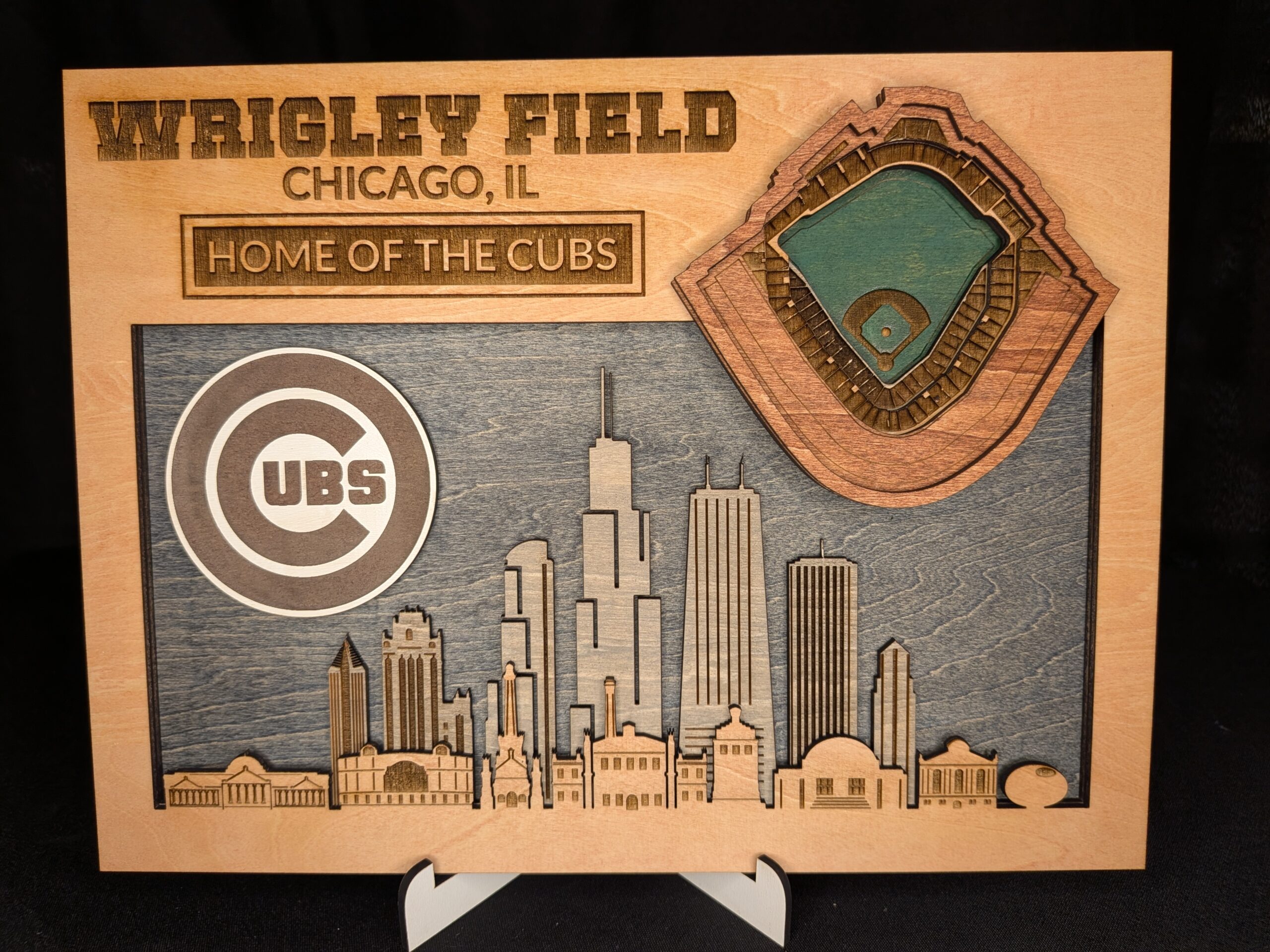 This 3d plaque is made from 5 layers of 1/8″ thick plywood, hand stained in varying colors to enhance the depth perception.   Featuring the skyline of the Second City and a prominently displayed logo of the Chicago Cubs in the top left.   This layered stadium shows off the levels within the stands so even when you’re not there in person, you can imagine one of the most storied franchises in baseball.